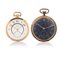 1. C. in oro giallo 18 kt con incisioni. Q. argentato con numeri Breguet applicati, secondi al 6. M. rodiato con scappamento ad ancora, carica manuale. 2. C. in metallo dorato con profili lavorati. Q. nero con indici applicati e secondi al 6 (ristampato). M. rodiato con scappamento ad ancora, carica manuale. Quadranti, casse e movimenti firmati.