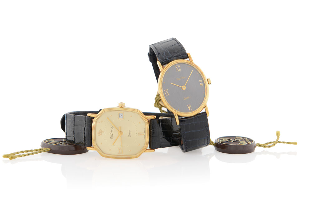 C. una ottagonale ed una ovale in oro giallo 18 kt. Q. uno champagne con indici e numeri romani applicati, secondi al centro e data al 3, uno grigio antracite con indici e numeri romani applicati. M. al quarzo. Quadranti e casse firmati. Completi di cinturini e fibbie originali.
