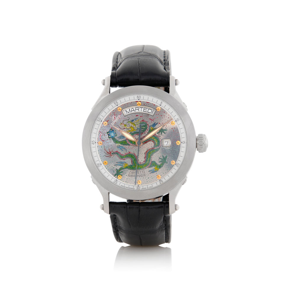 C. n. 1489/007 in acciaio con oblò decentrato sul fondello chiuso da viti, vetri zaffiro. Q. in metallo con dragone inciso e smaltato, indici applicati, lancette luminescenti, secondi al centro, finestrella per il giorno al 12 e data al 3. M. a carica automatica. Quadrante, cassa, vetro e movimento firmati. Completo di cinturino, fibbia double deployante in acciaio ed astuccio originali.