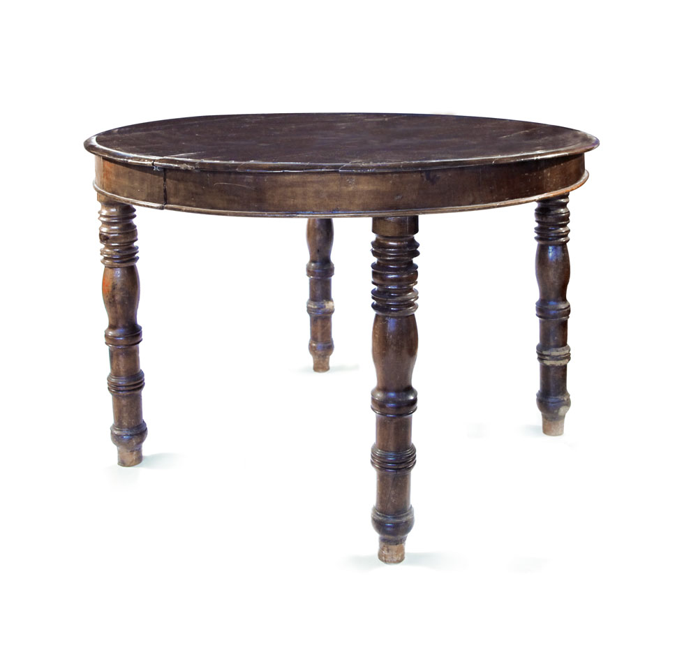 TAVOLO ALLUNGABILE IN NOCE, XIX SECOLO, piano circolare con fascia e sostegni torniti; privo di prolunghe; difetti e usure.
