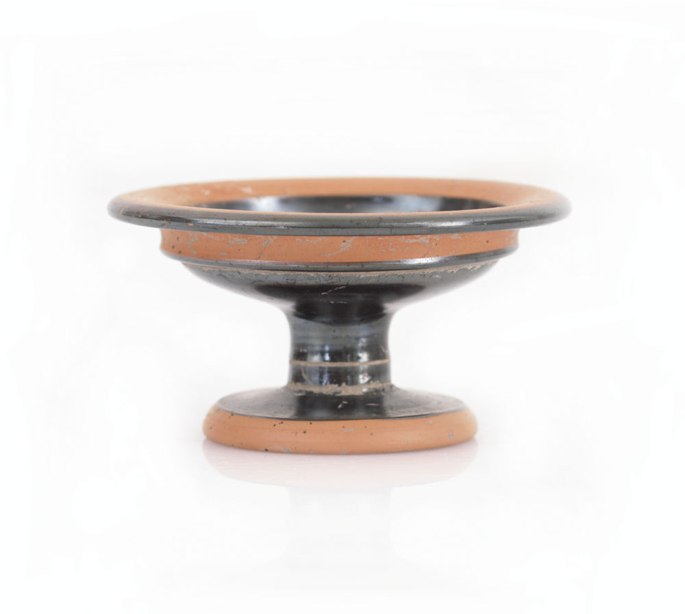 PICCOLA COPPA APULA IN TERRACOTTA VERNICIATA, MAGNA GRECIA, IV SECOLO A.C., orlo piatto e piede cilindrico su base circolare; usure.