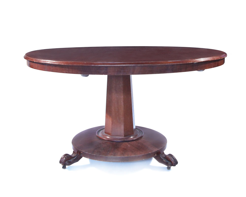 TAVOLO IN NOCE, XIX SECOLO, piano circolare con fascia, sostegno centrale e piedi ferini, mancanze e usure.
