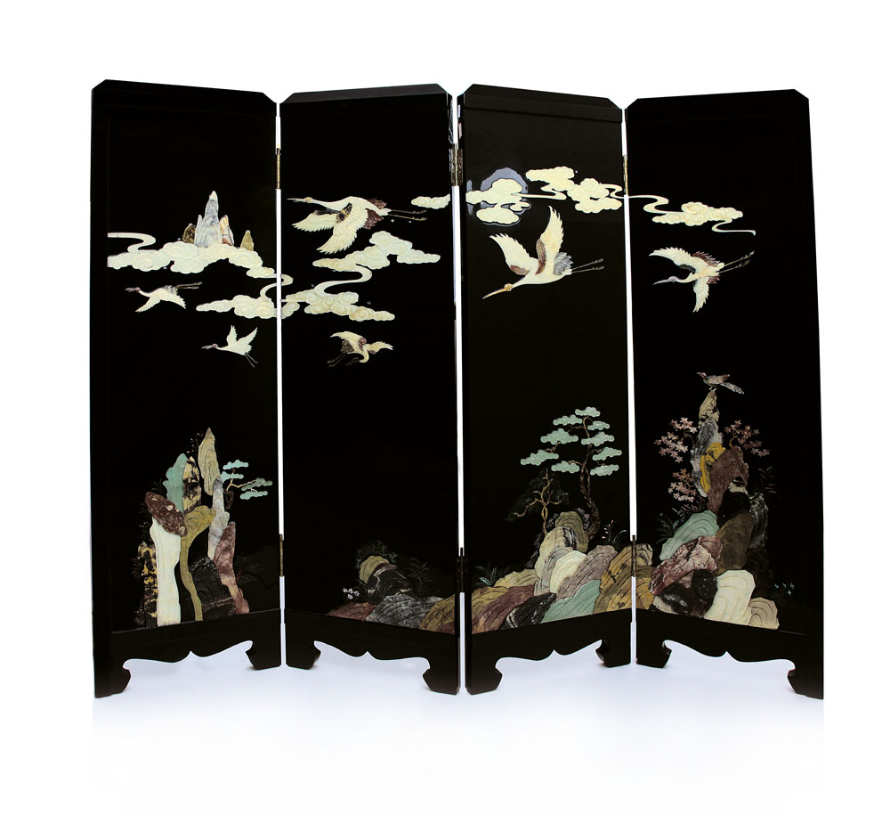 PARAVENTO IN LEGNO LACCATO CON APPLICAZIONI, GIAPPONE, XX SECOLO, a quattro ante con decori a paesaggio e uccelli in madreperla.