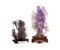 DUE SCULTURE IN PIETRA DURA, CINA, XX SECOLO, di cui una in fluorite con figura su pesce con base in legno e una in radice di ametista con kwan jin su base in legno.