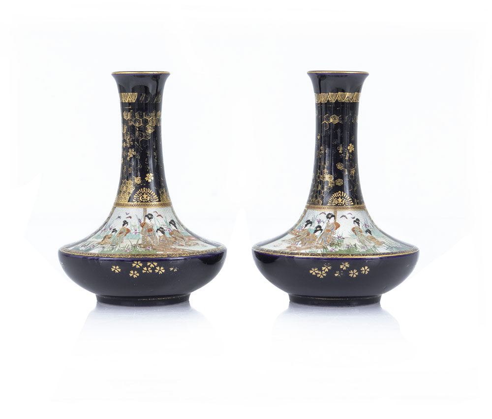 COPPIA DI VASI IN CERAMICA, SATSUMA, INIZIO XX SECOLO, decoro a figure entro riserve su fondo blu.