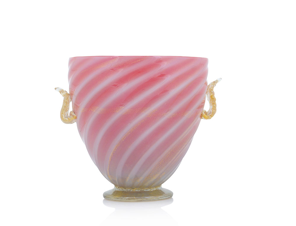 VASO IN VETRO CON ANSE APPLICATE A CALDO, MURANO, ANNI '60, costolato a onde con inclusioni in oro.