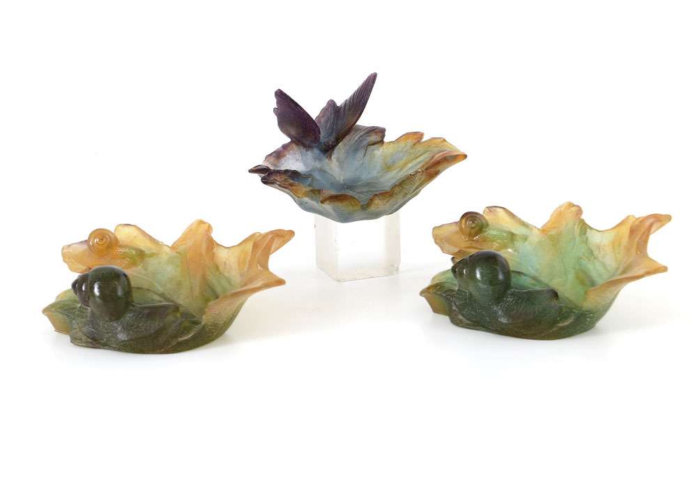 TRE CIOTOLE IN PASTE DI VETRO POLICROME, DAUM FRANCE, ANNI '70, due con lumache e una con farfalla; lievi sbeccature.