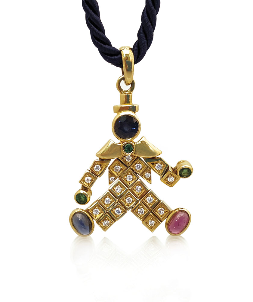 CIONDOLO. In oro giallo 18 kt realizzato a pupazzetto snodato con decori in diamanti taglio brillante per tot. cts. 0,30 ca., rubini, zaffiri e smeraldi taglio ovale cabochon e rotondo per tot. cts. 2,30 ca., trattenuto da cordino in tessuto blu con chiusura sferica in oro giallo 18 kt.