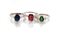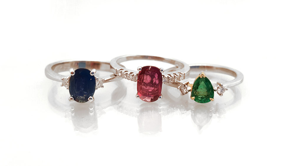 LOTTO DI TRE ANELLI. In oro bianco e giallo 18 kt centrati da rubino taglio ovale di cts. 1,20 ca., zaffiro taglio ovale di cts. 1,10 ca. e smeraldo taglio goccia di cts. 0,47 ca. con ai lati decori in diamanti taglio brillante per tot. cts. 0,25 ca.