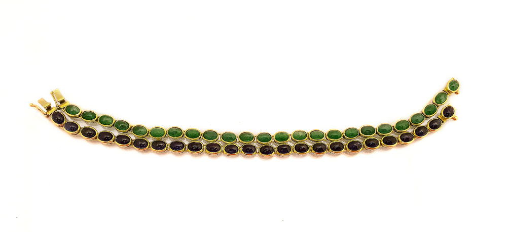 LOTTO DI DUE BRACCIALI. In oro giallo 18 kt uno con zaffiri taglio ovale cabochon per tot. cts. 13,00 ca. ed uno con smeraldi taglio ovale cabochon per tot. cts. 11,00 ca.