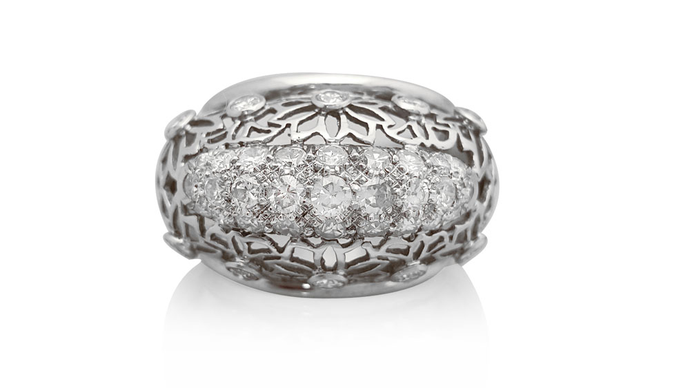 ANELLO. In oro bianco 18 kt, sommità bombata con motivi floreali traforati, diamanti taglio brillante per tot. cts. 1,50 ca. a decoro.