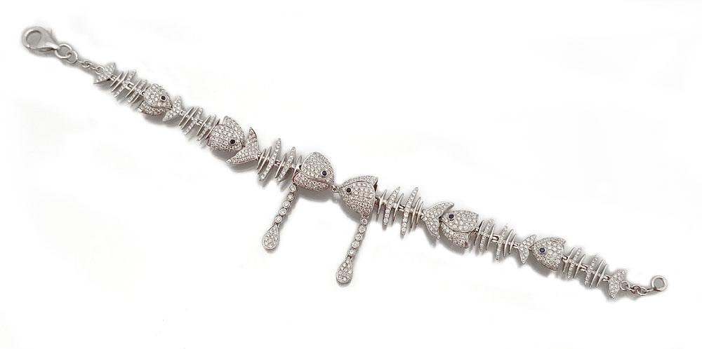 BRACCIALE. In oro bianco 18 kt maglie a lische di pesce con motivi oscillanti nella parte centrale, diamanti taglio brillante per tot. cts. 2,50 ca. disposti a pavè e piccoli zaffiri taglio rotondo agli occhi.