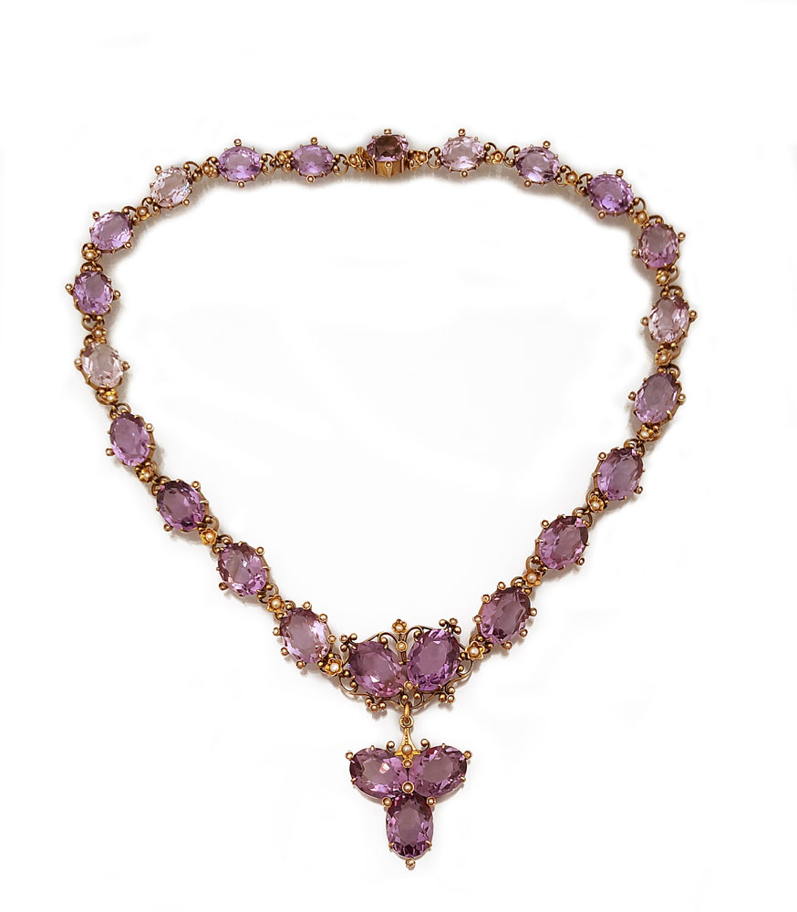 COLLANA XIX SECOLO. In oro rosè bassa caratura percorsa da ametiste taglio ovale disposte in gradazione dal centro per tot. cts. 90,00 ca. entro cornici floreali impreziosite da piccole perle coltivate e motivi a volute terminanti a ricciolo.