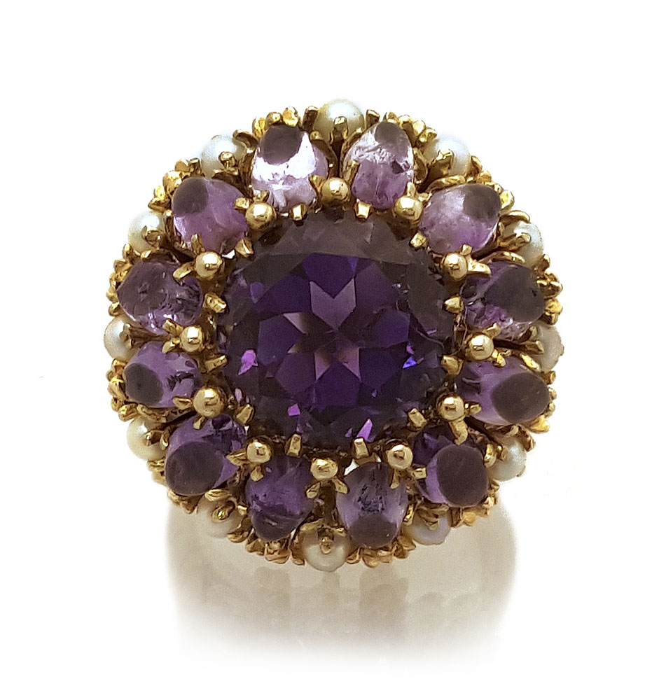 ANELLO ANNI '50 CA. In oro giallo 14 kt sommità circolare con ametiste taglio rotondo e navette cabochon per tot. cts. 8,00 ca. alternate a settori in piccole perle coltivate e boules lisce.