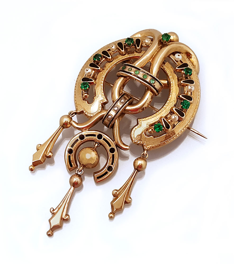 SPILLA XIX SECOLO. In oro giallo 18 kt montatura scatolata con elementi sovrapposti e pendenti nella parte terminale, profili incisi, piccole perle, gemme verdi taglio huit-huit e cabochon, motivi in smalto nero e boules lisce, chiusura ad ago semplice (visibili lievi segni di usura).