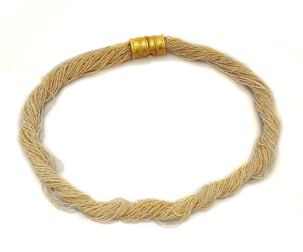 COLLANA. A cinquantuno fili di microperle a torchon con chiusura cilindrica in oro giallo 18 kt a lavorazione martellata.