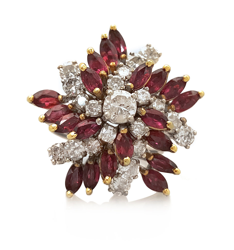 ANELLO. In oro bianco e giallo 18 kt sommità gradinata con struttura a "girandola", al centro diamante taglio brillante di cts. 0,30 ca. entro decori in rubini taglio navette per tot. cts. 1,70 ca. e diamanti taglio brillante per tot. cts. 1,30 ca.