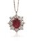 CIONDOLO. In oro bianco 18 kt realizzato a fiore con diamanti taglio brillante per tot. cts. 1,00 ca. e rubino taglio ovale di cts. 1,20 ca. disposto al centro, trattenuto da fine catenina in oro bianco 18 kt.