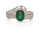 ANELLO. In oro bianco 18 kt montatura asimmetrica centrata da smeraldo taglio ovale di cts. 1,40 ca. entro decori laterali in diamanti taglio baguette incastonati a binario per tot. cts. 0,80 ca.