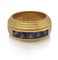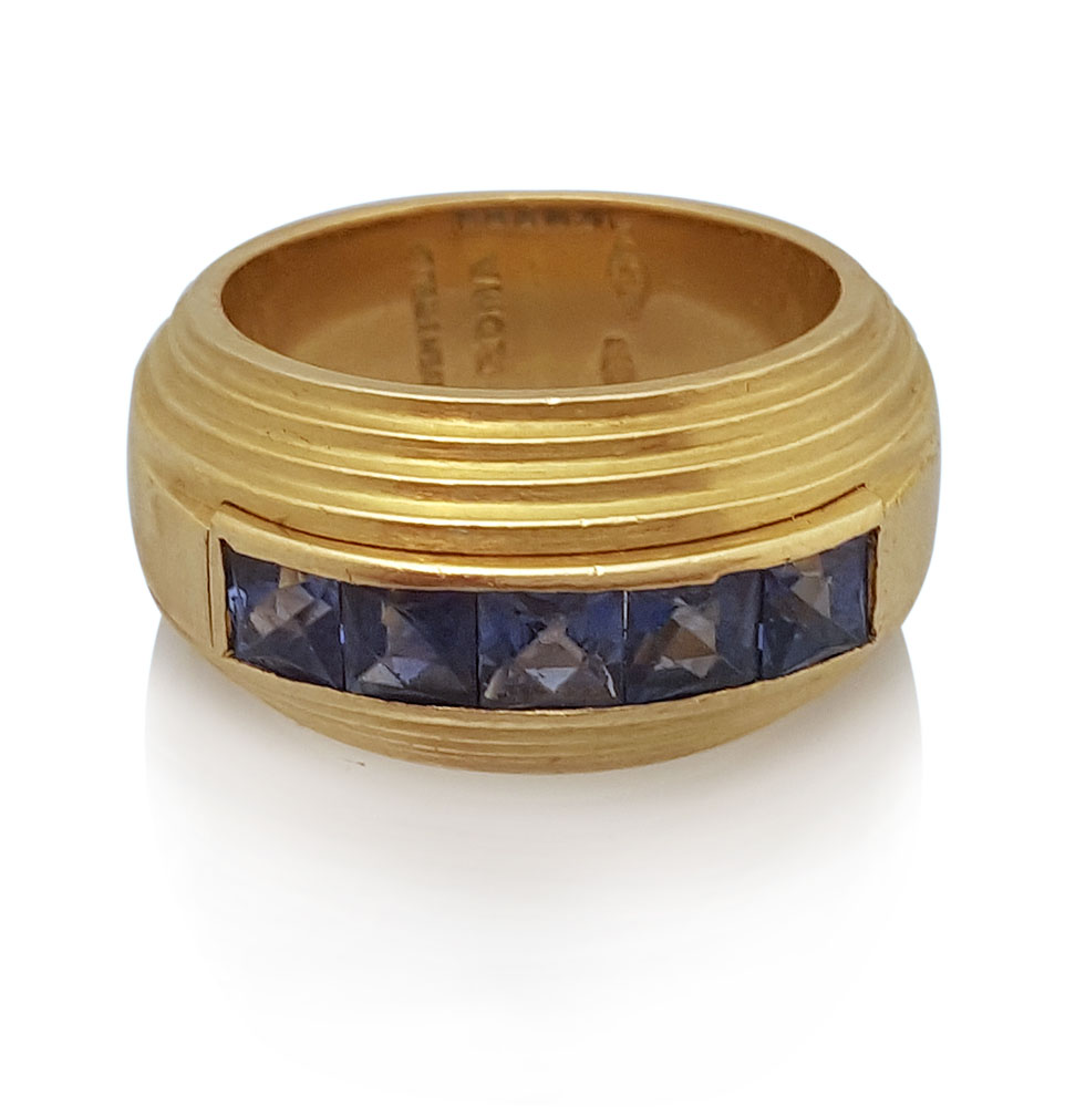 ANELLO. In oro rosè 18 kt montatura a fascia con motivo gradinato centrato da cinque zaffiri taglio quadrangolare sfaccettato per tot. cts. 0,75 ca. incastonati a binario, reca firma D. Ventrella.