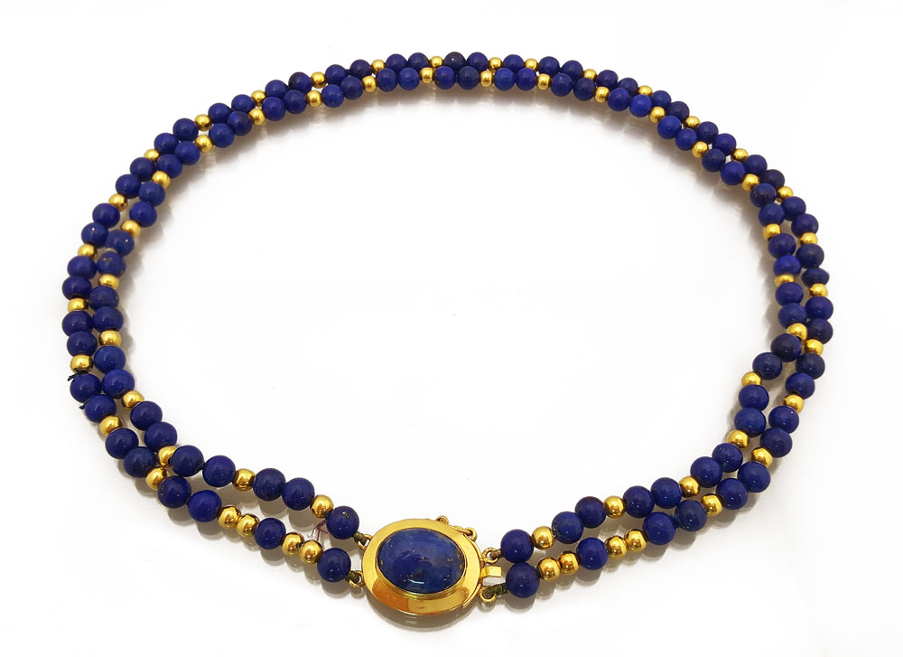 COLLANA. In oro giallo 18 kt, a due fili di sfere in lapislazzuli alternate a boules lisce con chiusura ovalizzata centrata da inserto taglio cabochon in lapislazzuli.