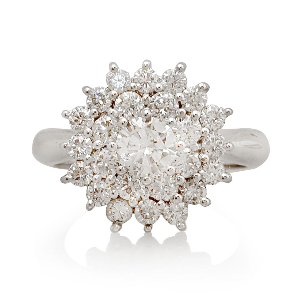 ANELLO. In oro bianco 18 kt a fiore con al centro diamante taglio brillante di cts. 0,45 ca. entro doppia cornice in diamanti taglio brillante per tot. cts. 1,30 ca.