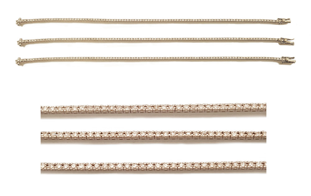 LOTTO DI TRE BRACCIALI TENNIS. In oro bianco 18 kt interamente percorsi da diamanti taglio huit-huit per tot. cts. 3,00 ca., entro castoni a quattro griffes.