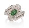 ANELLO. In oro bianco 18 kt montatura internamente foderata realizzata a volute con profili milligranati, al centro smeraldo taglio rettangolare a contorno ottagonale di cts. 0,70 ca. entro decori in diamanti taglio brillante per tot. cts. 0,80 ca.