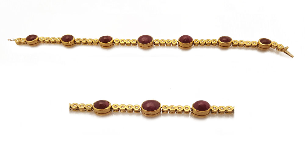 BRACCIALE. In oro giallo 18 kt a maglie circolari incernierate impreziosite da diamanti taglio brillante per tot. cts. 0,30 ca. con interruttori in rubini taglio ovale cabochon per tot. cts. 15,00 ca.