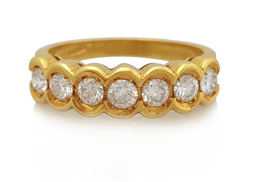 ANELLO. In oro giallo 18 kt con sette diamanti taglio brillante disposti a rivière per tot. cts. 0,70 ca. entro castoni tondi sagomati.