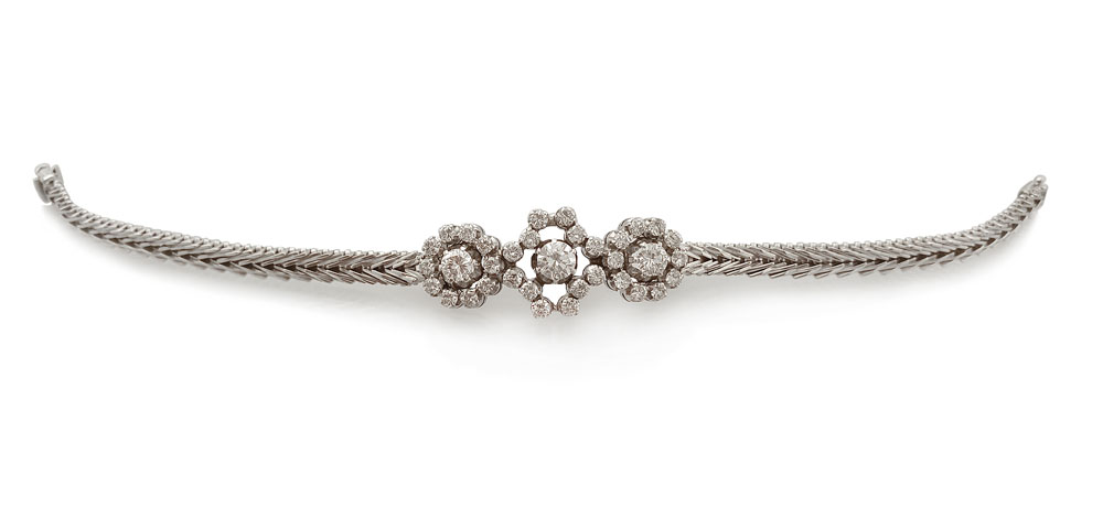 BRACCIALE ANNI '60 CA. In oro bianco 18 kt, maglie disposte a lisca con motivo centrale a tre diamanti taglio brillante per tot. cts. 1,10 ca. entro profili in diamanti taglio brillante per tot. cts. 2,20 ca.