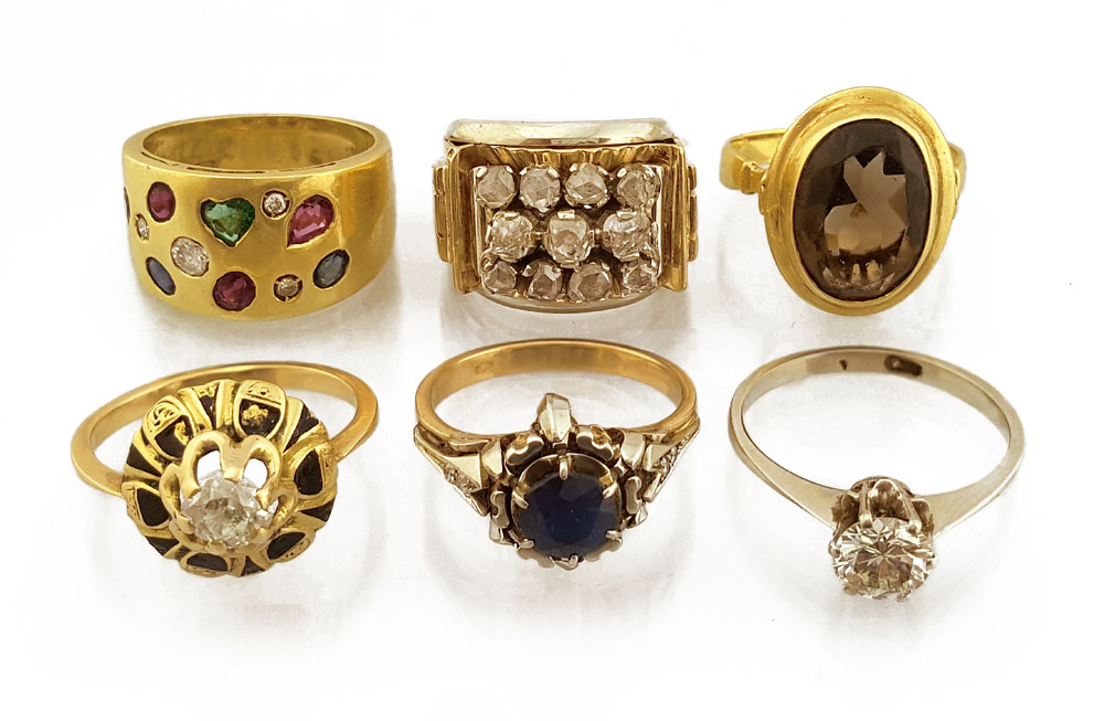 LOTTO DI SEI ANELLI. In oro giallo 18 kt e bassa caratura, di diversa forma e realizzazione con zaffiri smeraldi e rubini taglio ovale, rotondo, goccia e cuore per tot. cts. 1,30 ca., quarzo fumè taglio ovale di cts. 4,00 ca., diamanti taglio brillante, vecchio, huit-huit e rosa per tot. cts. 1,50 ca.