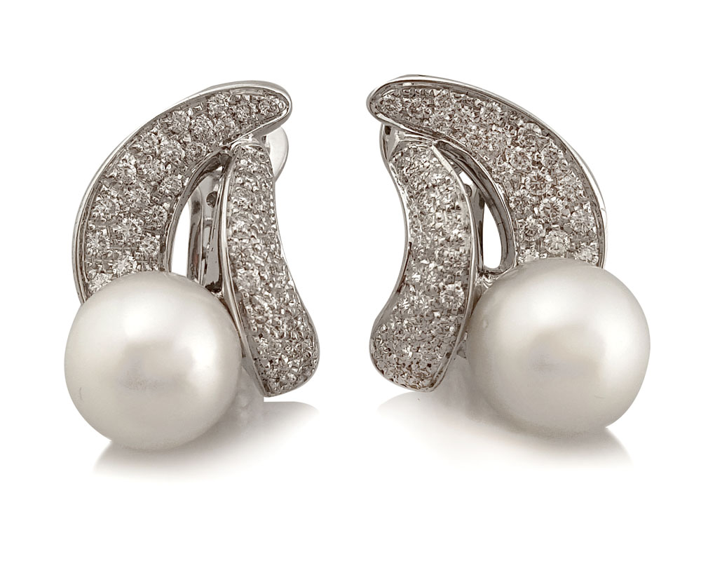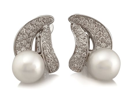 COPPIA DI ORECCHINI. In oro bianco 18 kt, perno e clip, montatura a volute con diamanti taglio brillante disposti a pavè per tot. cts. 1,00 ca. e perle coltivate South Sea di mm 11 ca. imperniate nella parte terminale.