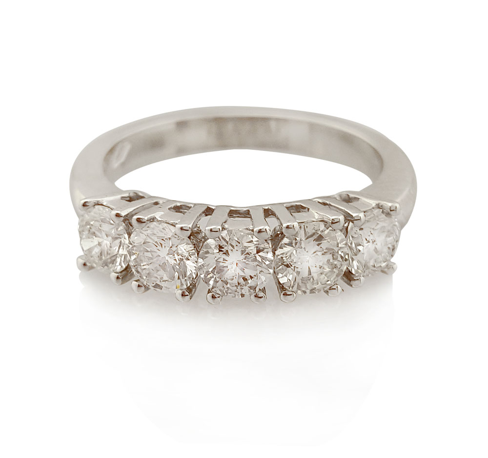 ANELLO. In oro bianco 18 kt con cinque diamanti taglio brillante disposti a rivière per tot. cts. 1,30 ca. entro castoni a quattro griffes.