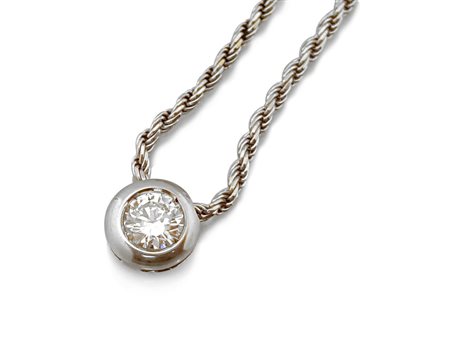 CIONDOLO. In oro bianco 18 kt con diamante taglio brillante di cts. 0,40 ca. (prob. colore H purezza VVS) entro castone a cipollina trattenuto da catenina a cordone ritorto in oro bianco 18 kt.