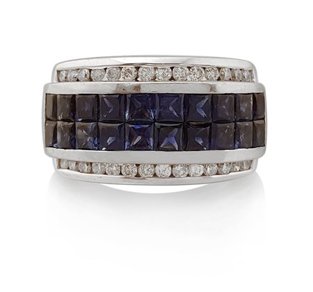 ANELLO. In oro bianco 18 kt internamente foderato, realizzato a fascia con motivo centrale in zaffiri taglio carrè per tot. cts. 2,60 ca. entro doppia fila di diamanti taglio brillante per tot. cts. 0,50 ca. incastonati a binario.