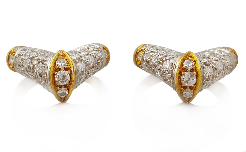 LOTTO DI DUE ANELLI. In oro giallo e bianco 18 kt sommità a "V" impreziosite da diamanti taglio brillante e huit-huit per tot. cts. 0,95 ca.