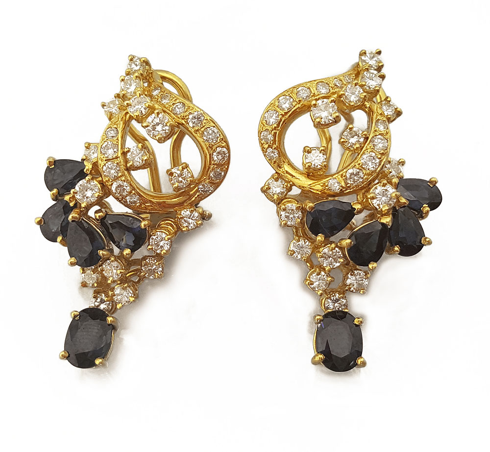 COPPIA DI ORECCHINI. In oro giallo 18 kt perno e clip, settori superiori a volute, decori in diamanti taglio brillante per tot. cts. 2,30 ca. disposti a fantasia, zaffiri taglio ovale e goccia per tot. cts. 5,00 ca.