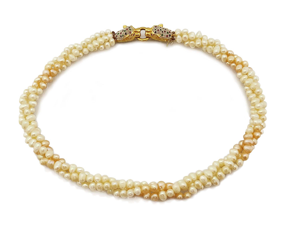 COLLANA. A tre fili di perle coltivate d'acqua dolce con diverse sfumature di colore, chiusura in oro bianco e giallo 18 kt a teste feline impreziosite da zaffiri, rubini, smeraldi taglio rotondo per tot. cts. 0,70 ca. e piccoli diamanti taglio huit-huit.