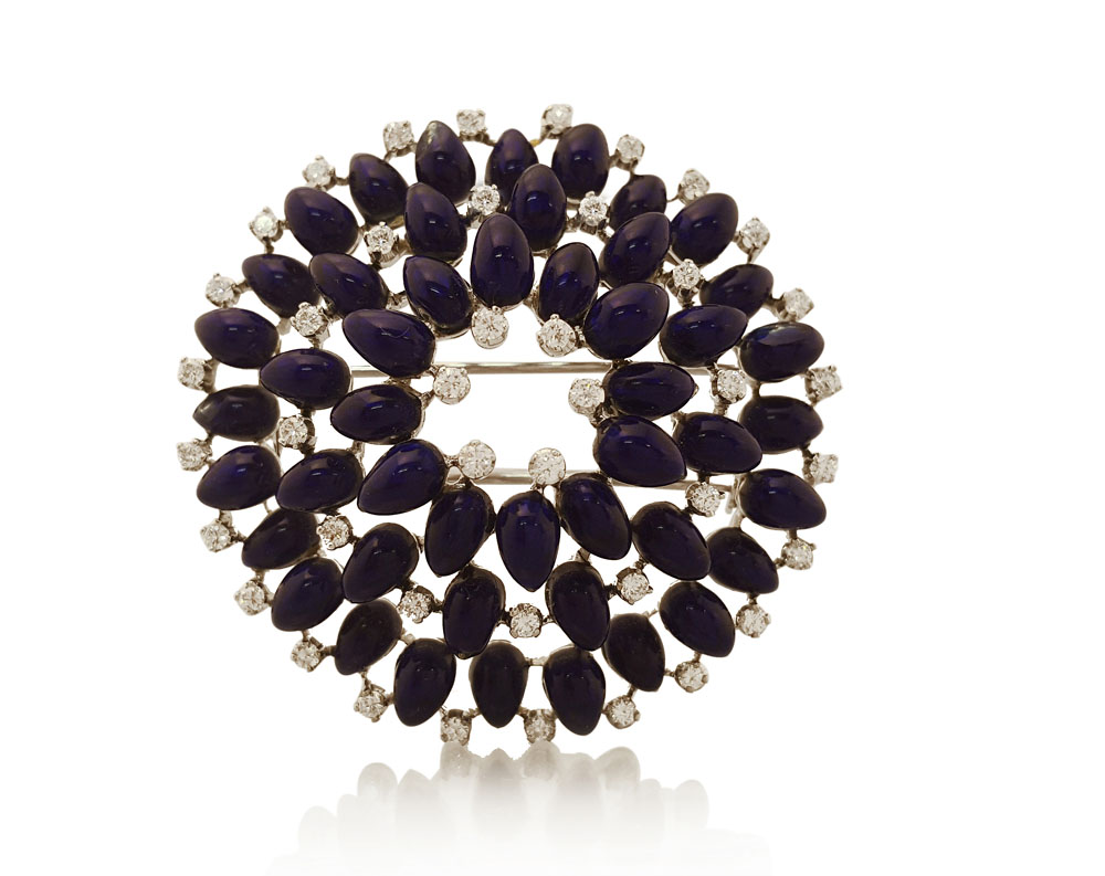 SPILLA ANNI '60 CA. In oro bianco 18 kt realizzata a settori circolari concentrici disposti a gradini con interruttori a goccia in smalto blu e diamanti taglio brillante per tot. cts. 1,10 ca., chiusura a doppio ago.