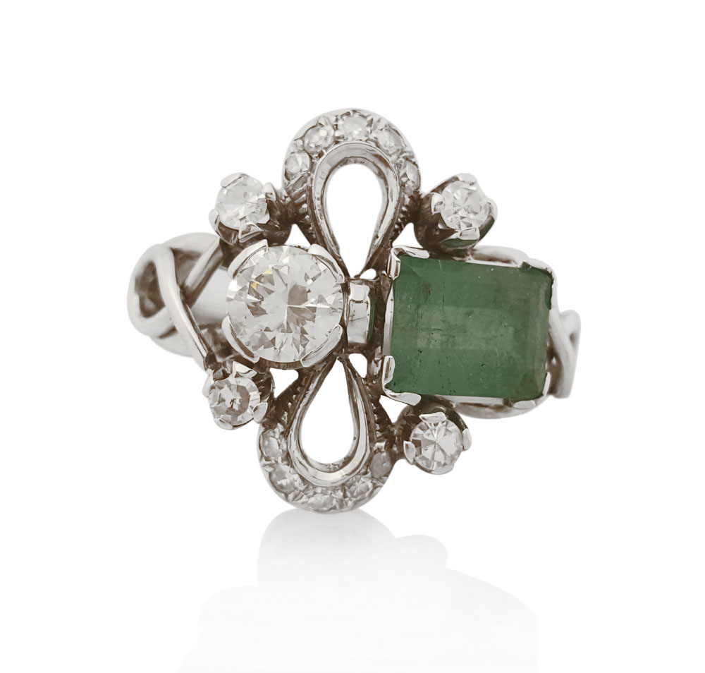 ANELLO ANNI '30 CA. In oro bianco 18 kt, fronte asimmetrico impreziosito da diamante taglio brillante di cts. 0,50 ca. (prob. colore L purezza VS), smeraldo taglio rettangolare di cts. 1,50 ca. e diamanti taglio huit-huit per tot. cts. 0,20 ca. a decoro.