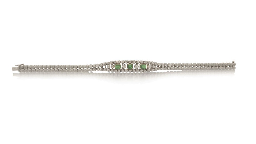 BRACCIALE. In oro bianco 18 kt maglia a demiboules incise con settore centrale decorato da tre smeraldi taglio rettangolare a contorno ottagonale per tot. cts. 1,00 ca. e diamanti taglio brillante per tot. cts. 1,70 ca.