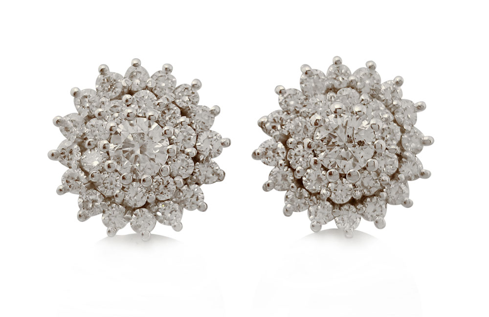 COPPIA DI ORECCHINI. In oro bianco 18 kt, perno e farfalla, montatura a fiore con al centro diamanti taglio brillante per tot. cts. 0,50 ca. entro doppie cornici in diamanti taglio brillante per tot. cts. 1,20 ca.