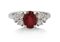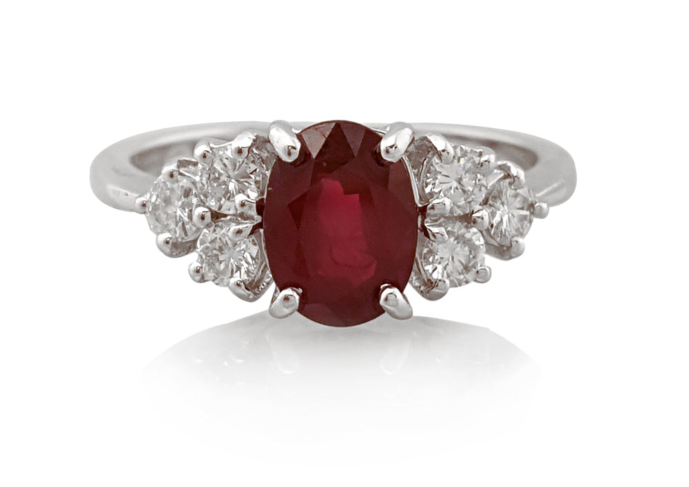 ANELLO. In oro bianco 18 kt con rubino Burma (Myanmar - Mong Hsu) taglio ovale di cts. 1,34 entro decori laterali in diamanti taglio brillante per tot. cts. 0,50 ca. (prob. colore G purezza VS), il rubino è accompagnato da certificato gemmologico n. CR.X5118003, analisi pietre preziose Dott. Giulio Provera, Valenza (AL)
