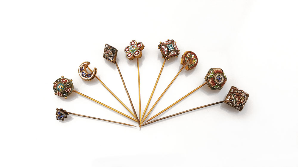 LOTTO DI NOVE SPILLONI DA GIACCA XIX SECOLO. In metallo dorato ed argento con decori superiori realizzati in micromosaico, piccole boules lisce e settori in filo ritorto applicato.
