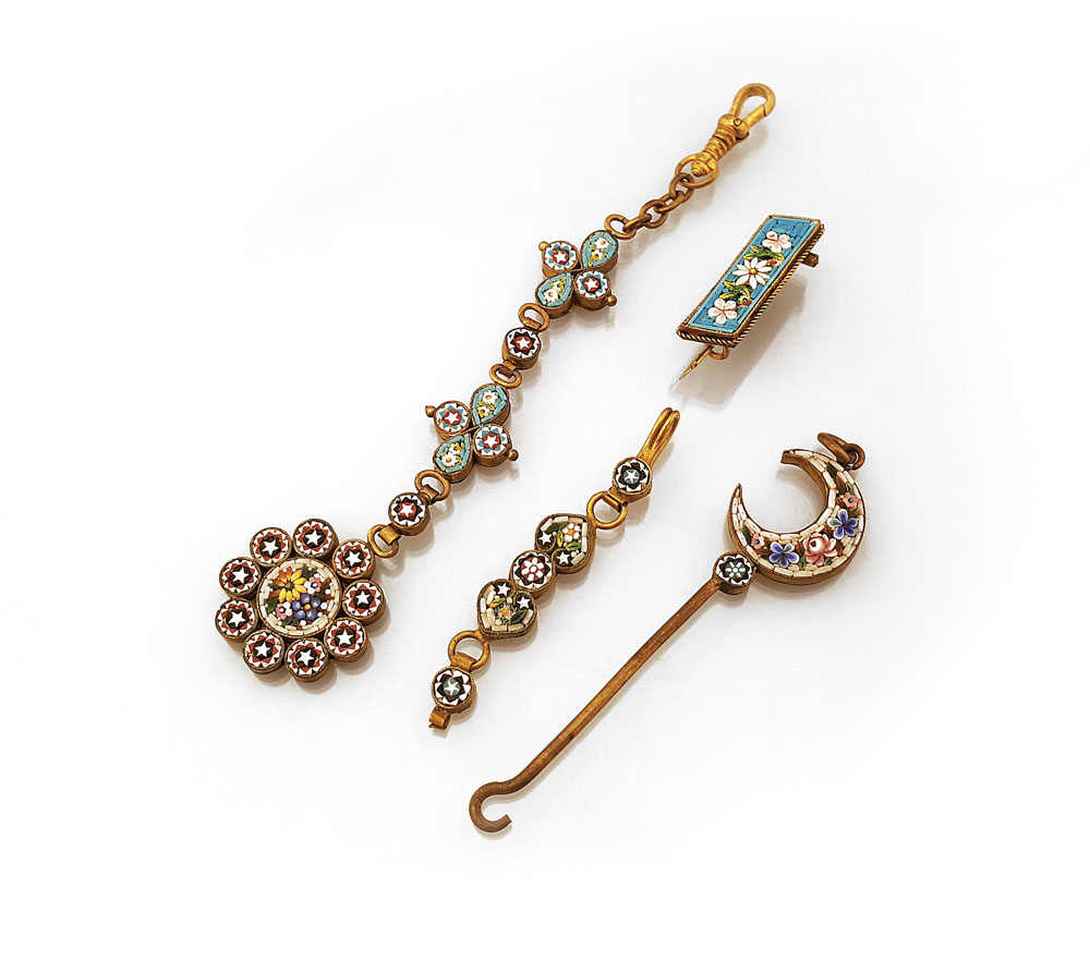 LOTTO DI QUATTRO GIOIELLI XIX SECOLO. In metallo dorato, composto da tre ciondoli ed una spilla con chiusura ad ago semplice di diversa forma e realizzazione impreziositi da motivi in micromosaico floreale e filo ritorto applicato.
