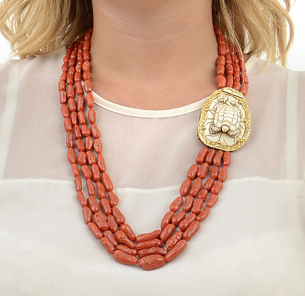 COLLANA. A quattro fili di inserti in corallo rosso impreziositi da grande chiusura in oro giallo 18 kt martellato con bordi lavorati a giorno trattenente Netsuke in avorio scolpito raffigurante tartarughe.