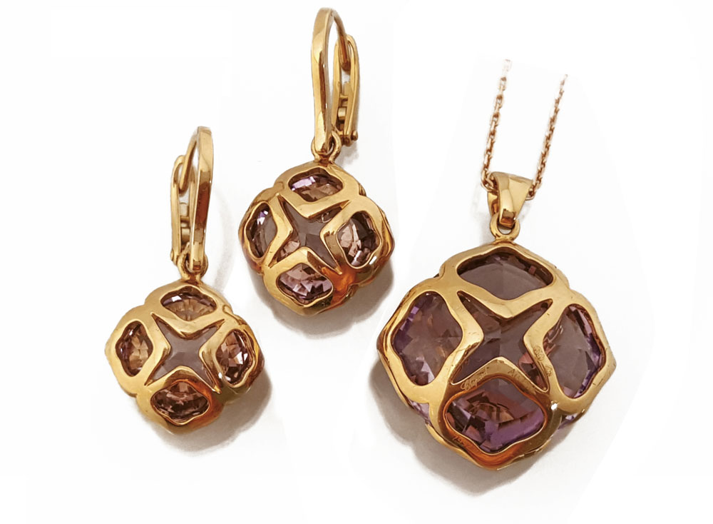DEMI PARURE DI CHOPARD. In oro rosè 18 kt composta da coppia di orecchini pendenti perno e clip e da ciondolo trattenuto da catenina, realizzati a motivi traforati oscillanti con inserti interni in ametiste taglio fantasia, gioielli numerati: 799220-3316428 839221-3322716.