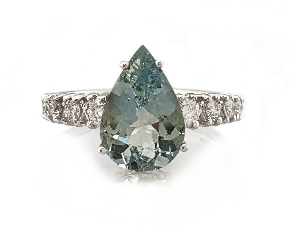 ANELLO. In oro bianco 18 kt centrato da acquamarina taglio goccia di cts. 3,00 ca. entro decori laterali in diamanti taglio brillante per tot. cts. 0,40 ca.