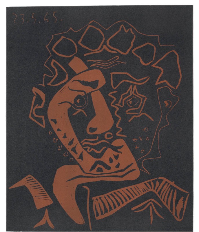 Pablo Picasso Malaga 1881 - Mougins 1973 Le Danseur, 1965 Incisione su linoleum, es. 32/200, cm. 64x53 (lastra), cm. 75,2x62 (carta) Data in lastra in alto a destra: 23.5.65 (speculare); firma a matita sul margine in basso a destra: Picasso, tiratura in basso a sinistra: 32/200. Tiratura di 200 esemplari. Realizzata per l'esposizione Picasso et le Théatre, Tolosa, Musée des Augustins, giugno - settembre 1965. Bibliografia: Georges Bloch, Pablo Picasso. Tome II Catalogue de l'oeuvre gravé et lithographié 1966-1969, Kornfeld et Klipstein, Berne, 1971, p. 342, n. 1849 (con misure cm. 56,4x44,3).
